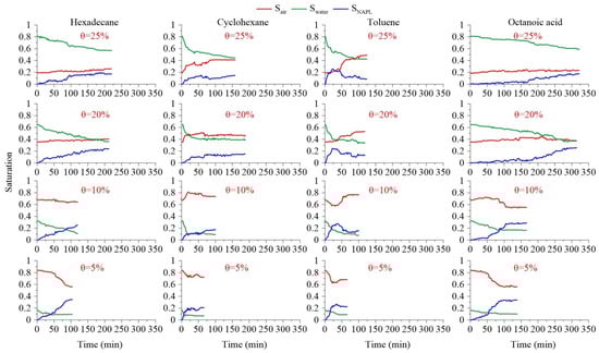 When components of pollutants migrate into an underground environment, they are mainly affected by environmental media, such as soil, moisture, and gases. Therefore, the properties of the environmental medium determine the mobilization process and final fate of the components. As the most active medium, water plays a key role in the interactions between substances. Therefore, the relationship between the saturation of different forms with time was measured and calculated in the experiment, and the results are shown in Figure 10.