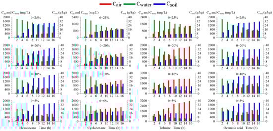As can be seen in Figure 11, only toluene had a higher concentration in the gas samples obtained (with an average value of 1597.3 mg/L), which gradually increased with time; furthermore, volatilization at a low moisture content was stronger than at a high moisture content. This is mainly because, when the moisture content is high, the pore space is smaller, the volatilization is lower, and the components are mainly miscible with water; meanwhile, when the moisture content in the soil is low, the components tend to enter the soil pores, where the large pore space results in greater volatilization. However, after entering the soil pores, the volatilized toluene cannot escape from the soil column immediately. Instead, it is still imprisoned in the soil pores, causing the gas phase concentration in the pores to increase. The concentrations of hexadecane, cyclohexane, and octanoic acid were maintained at very low levels, with average values of 334.4, 868.3, and 502.6 mg/L, respectively. Similarly, hexadecane and octanoic acid remained in the soil in the highest amounts due to their strong viscosity, while toluene and cyclohexane left fewer residues. As the water solubility of petroleum components is low, their dissolved concentration in water is very low, and they are mainly free in water.