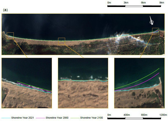 Projected shorelines between 2021 and 2100 according to (a) RCP4.5 and (b) RCP8.5.