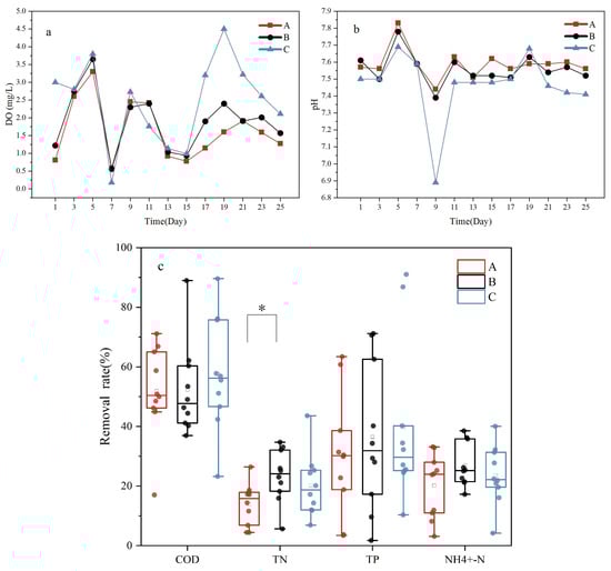 Different gas-to-water ratios were used to assess the effectiveness of the water treatment using Vallisneria. These gas-to-water ratios were 10:1 (A), 15:1 (B), and 20:1 (C). The removal rates for the various indicators were as follows: A—COD, 51.92 ± 15.37%; TN, 13.90 ± 7.08%; TP, 30.32 ± 6.42%, NH4+-N, 20.13 ± 10.71%; B—COD, 57.51 ± 19.08%%; TN, 23.49 ± 8.86%; TP, 36.49 ± 7.81%, NH4+-N, 26.97 ± 7.31; and C—COD, 57.51 ± 19.08%; TN, 20.24 ± 10.49%; TP, 20.51 ± 8.56%, NH4+-N, 23.64 ± 9.89%. Significant differences in TN removal between groups A and B were noted (p < 0.05), with no significant differences found for other parameters. The DO in the outflow water for groups A, B, and C averaged 1.64 ± 1.31 mg/L, 1.89 ± 1.20 mg/L, and 2.46 ± 0.90 mg/L, respectively, while the average pH values in these groups were 7.58 ± 0.08, 7.56 ± 0.90, and 7.46 ± 0.19, respectively. All three gas-to-water ratios resulted in an increase in the concentration of DO in the effluent (Figure 1a). The COD removal rates increased, whereas the pH decreased with rising gas-to-water ratios, with a significant difference in pH value between conditions A and C. Increases in COD removal rates and decreases in pH values upon increasing gas-to-water ratios could possibly be a result of a positive correlation between the DO and COD and a negative correlation between the DO and pH [22].
