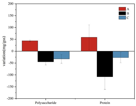 Additionally, within group A, the relative abundance of Zoogloea and Azohydromonas was relatively high. Zoogloea can promote the production of EPSs [38], and Azohydromonas mainly functions in alkalinization, with alkaline conditions being favorable for EPS growth. The pH value in group A was indeed significantly higher than in the other two groups, and this may be the main reason for the significant initial rise in EPS content under conditions of a low gas-to-water ratio (Figure 1c and Figure 2). In systems B and C, both Ramlibacter and Limnothrix were significantly higher than in group A (p < 0.05), and these bacteria have been reported to contribute to EPS accumulation [39,40,41]. However, the EPS content in systems B and C decreased from the initial state, possibly because these systems promoted the growth and metabolism of bacteria such as Pseudomonas and Flavobacterium that can decompose several polysaccharides. Flavobacterium also produces weak acids, which might be detrimental to EPS accumulation [42,43].