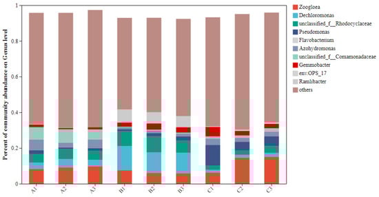 At the genus level, the top 10 abundant bacteria accounted for 35.92%, 47.09%, and 37.54% of the total bacteria in groups A, B, and C, respectively, with the dominant genera being Dechloromonas, unclassified_f__Rhodocyclaceae, unclassified_f__Comamonadaceae, Zoogloea, Gemmobacter, Azohydromonas, env.OPS_17, and Ramlibacter (Figure 3).