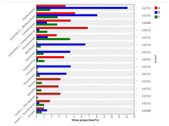 Differences in the mean relative abundance of the same species among different groups. Note: the y-axis represents the species name at a certain taxonomic level; the x-axis represents the average relative abundance of the species in different groups; the colored bars represent different groups; and the column of numbers on the right-hand shows the p-values. The “*” on the right axis of the figure represents significant differences in the genus of bacteria among different groups.