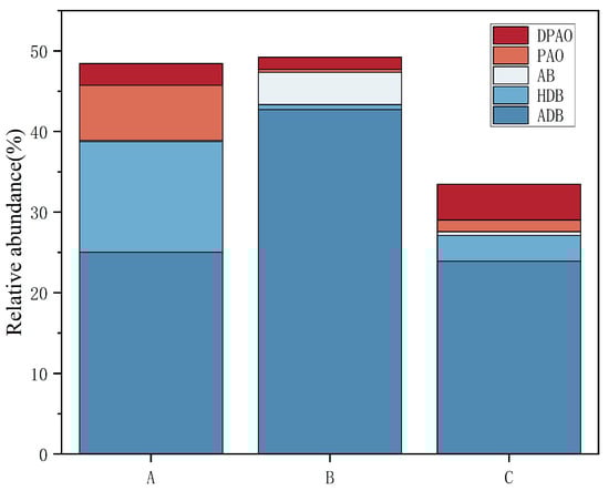 Group A was significantly enriched with genera such as Azohydromonas (4.557%), unclassified_f__Comamonadaceae (6.841%), Aquabacterium (3.667%), norank_f__Polyangiaceae (3.178%), Thauera (3.204%), Ideonella (2.925%), and norank_f__Roseiflexaceae (1.784%). Aquabacterium and unclassified_f__Comamonadaceae are known as heterotrophic anoxic denitrifiers [27,28], Ideonella as heterotrophic nitrifying-aerobic denitrifiers [29], and Thauera as facultative heterotrophic denitrifiers [30,31]. In group B, significantly enriched genera included Dechloromonas (12.13%), unclassified_f__Rhodocyclaceae (8.092%), Ramlibacter (6.503%), Arenimonas (4.499%), Limnothrix (4.559%), Thermomonas (3.992%), and Azospira (1.412%). Dechloromonas, Rhodocyclaceae, Azospira, and Arenimonas are heterotrophic nitrifying aerobic denitrifiers [32,33,34,35], and Thermomonas are autotrophic nitrifying aerobic denitrifiers [36]. In group C, Flavobacterium (4.454%) was significantly enriched as a heterotrophic nitrifying aerobic denitrifier (Figure 4).