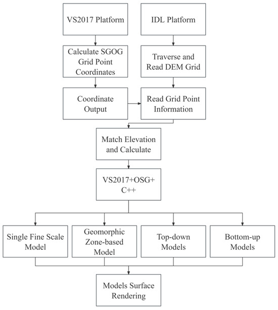 This study adopts Visual Studio 2017 (VS2017) as the development platform, utilizes the open-source 3D graphics toolkit Open Scene Graph(OSG) as the graphics engine, employs standard C++ as the development language, and utilizes the Interactive Data Language (IDL) to process the DEM source data to establish the experimental environment. Initially, we conducted computations and conversions of the SGOG tile grid point coordinates, matched the longitude and latitude coordinates with the DEM grid, and then proceeded with grid point elevation interpolation calculations and stratigraphic data matching. Subsequently, hybrid multiscale grid modeling was performed, followed by hierarchical color rendering. The overall technical approach is illustrated in Figure 2.
