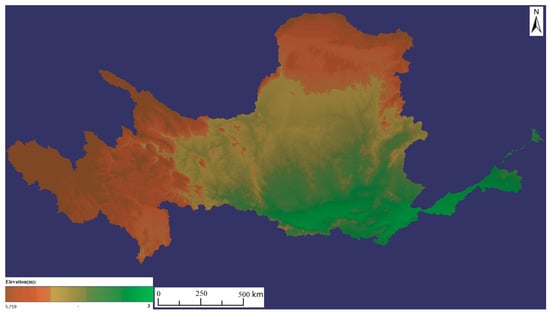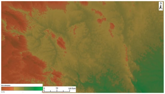 Considering the computational and storage capabilities of a single machine, the modeling is based on the SGOG 9th, 10th, 11th, and 12th level subdivision tiles (corresponding to approximate grid surface edge lengths of 19.49 km, 9.75 km, 4.87 km, and 2.44 km, respectively). DEM data covering the Yellow River basin area were downloaded from the shared website (http://www.ncdc.ac.cn/, accessed on 1 March 2023), specifically the SRTM v4.1 data with a 30 m resolution. The basic parameters included the UTM/WGS-84 projection, GeoTIFF format, 84,467 × 34,894 pixels, with elevations relative to the geoid of the WGS-84 ellipsoid.
