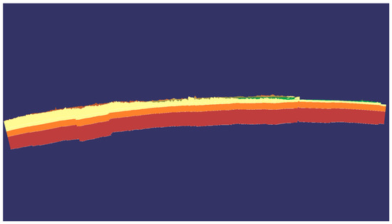 DEM and ETG are essentially based on the discrete representation of geographic space through sampled points. Naturally, a higher sampling density leads to a higher expression accuracy. Owing to the limitations of the computational power available in this study, the maximum level of SGOG grid partitioning allowed the entire Yellow River Basin crustal simulation to be at the 12th level. To provide a comparative benchmark for the various modeling methods, the results of the Yellow River simulation platform were obtained following the aforementioned technical approach, as shown in Figure 3. Using the mean elevation of each surface triangular grid point as an index, the corresponding thresholds were set and hierarchical color rendering was performed based on different threshold levels, resulting in the rendering of the Yellow River Basin, as shown in Figure 4. A side view of the rendering is displayed in Figure 5, where the curvature of the Yellow River Basin’s crust and the vertical stratigraphic structure can be observed. A local zoomed-in view is shown in Figure 6.