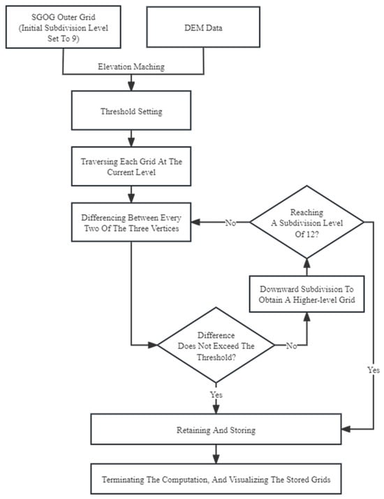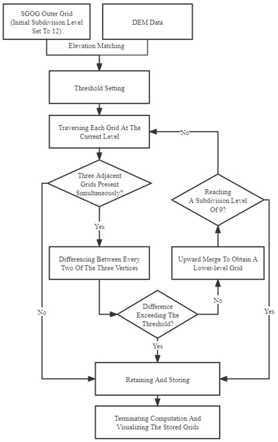 (3) The elevation differences between pairs of vertices on the outer grid are calculated, and the values are compared against the threshold Δ to determine whether to retain or subdivide. A technical roadmap for this method is shown in Figure 8.