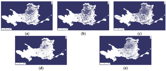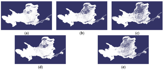 Crustal grid modeling results in the Yellow River Basin under different elevation difference thresholds in the top-down approach. (a). Fixed threshold at 50 m. (b). Fixed threshold at 100 m. (c). Fixed threshold at 150 m. (d). Variable threshold range: 50 m–100 m–150 m. (e). Variable threshold range: 150 m–100 m–50 m.
