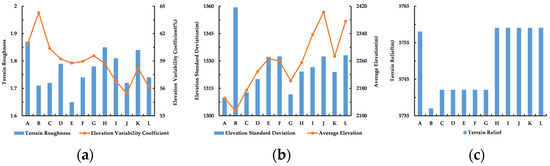 Terrain feature representation. (a): Terrain roughness and elevation variability coefficient. (b): Elevation standard deviation and average elevation. (c): Terrain relief.