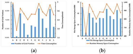 Computational efficiency. (a): Number of grid vertices and time consumption. (b): File storage space consumption and runtime memory space consumption.