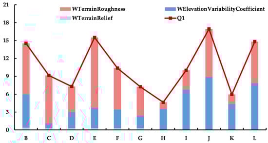 From Table 5, it can be observed that from the perspective of terrain information expression, the bottom-up method is superior to the top-down method, with the geomorphic zoning method ranking in the middle and later positions. Specifically, the bottom-up 50 m threshold (H) and the 50–100–150 m dynamic threshold (K) models rank in the top two positions, while the top-down 150–100–50 m dynamic threshold (G) and the 100 m fixed threshold (D) models rank 3rd and 4th, and the scores of the two are basically comparable. The top-down 50 m fixed threshold (C), bottom-up 100 m fixed threshold (I), and top-down 50–100–150 m dynamic threshold (F) models had similar scores, ranking 5th to 7th, and the geomorphic zoning method (B) ranks 8th. Finally, the bottom-up 150–100–50 m dynamic threshold (L), top-down 150m fixed threshold (E), and bottom-up 100m fixed threshold (J) models rank 9th to 11th. The quality indices for rankings 8–11 were all greater than 14 and were essentially in the same category. Figure 14 is shown below.