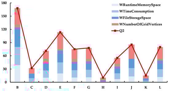 Each indicator has a different influence on the quality of the model relative to the aforementioned quality standards and indicators. The quality index for terrain information-related indicators is better when is smaller, whereas a larger quality index is preferable for efficiency-related indicators. These are referred to as negative and positive indicators, respectively. Accordingly, the negative and positive quality indices, Q1 and Q2, are defined as follows: