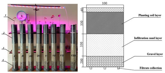 Experimental filter columns and a schematic diagram: 1—Physocarpus opulifolia Diabolo; 2—soil layer; 3—sand layer; and 4—gravel layer.