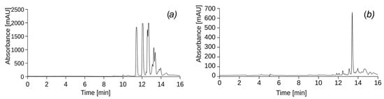 The UV-vis spectra show that the peaks in the chromatogram of the sand layer extracts (Figure A3), obtained by scanning in the wavelength range from 200 to 400 nm, usually appear between 12 and 18 min. All the spectra have a large peak at 210–230 nm and a weak peak at 250–270 nm, which corresponds to the two maximum UV absorption levels for PHs.