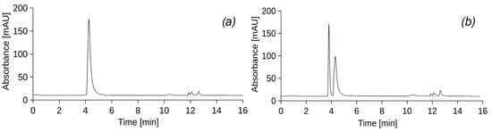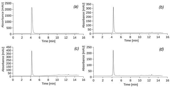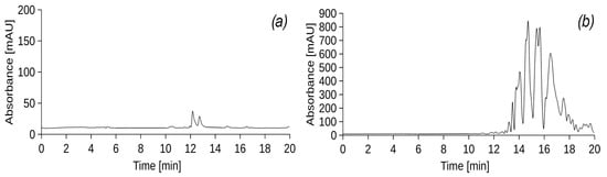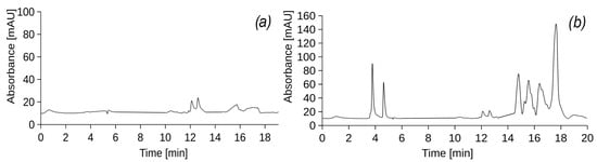 The study was carried out on an Agilent 1100 system (Agilent Technologies, Inc., Santa Clara, CA, USA) with a four-channel pump and a diode array detector after pre-filtering through iPure filters with a nylon membrane with a pore diameter of 0.22 µm. A Zorbax SB C-18 4.6 × 250 mm chromatographic column with a 5 μm grain diameter was used to separate the substances in the samples. The sample volume was 5 mm3. The mobile phase consisted of a mixture of an aqueous solution of orthophosphoric acid (0.050 M) and acetonitrile. The elution was started with a proportion of acetonitrile of 5%, which was increased to 100% after 10 min. The flow rate was 0.6 cm3/min, and the total analysis time was 16 min. The column separation temperature was 20 °C. Detection was performed at a wavelength of 206 nm. Blank chromatograms were also recorded with 5 mm3 of pure hexane and water separately.