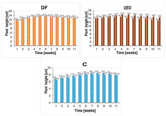 The quality of the leachate was monitored by taking samples at the outlet of the experimental columns at intervals of three months. The total volume of each sample taken for analysis was 100 cm3. The samples were collected in glass flasks and stored in a cooling bag until transported to the laboratory, where they were placed in refrigerators until further analysis. The content of PHs in the leachate samples was determined by the HPLC method at the Institute of High Molecular Weight Chemistry of the National Academy of Sciences of Ukraine. The first leachate samples were collected from columns I and II (with vegetation) and analysed on 13 January 2024 to determine the presence of UEO, from columns V and VI (with vegetation) to detect DF, and from columns VII and VIII (without vegetation) to determine the presence of both UEO and DF, respectively. Samples were not taken from columns III and IV (with vegetation), as these sites were not irrigated with model PHs and were used as controls to observe plant development.