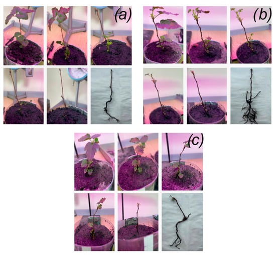Taking into account the above, the following experimental procedure was adopted. Plants of the Physocarpus opulifolia Diabolo species were planted on 12 October 2023 in experimental filter columns I to VI. Columns VII and VIII were left without vegetation. To support the physiological development of plants, red–blue artificial LED lighting was used, which was calculated according to the method described by the authors of []. After planting, the plants were regularly watered with tap water without any additional nutrients to accelerate their adaptation period, which lasted 10 to 20 days after planting and was controlled by measuring the height of each sample and recording the appearance of new leaves.