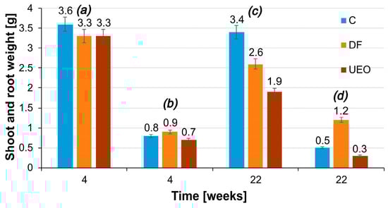 The results of HPLC indicate the absence of UEO and DF components in the filtrates of all experimental columns. However, an intense peak with a retention time of 4.22 min was observed in each sample. The UV-vis spectrum (Figure A2) of this peak does not correspond to any of the components of the model petroleum hydrocarbons. It can be assumed that the peak belongs to a substance released by the roots of the Physocarpus opulifolia Diabolo plant into the soil, which requires further study of the bioremediation process. It should also be noted that at certain wavelengths (240 and 290 nm), PHs can affect other compounds absorbing UV light, such as fulvic and humic acids of the soil matrix, and these effects were not properly assessed. The soil used in this experiment was fertile sandy loam soil with a high organic matter content, and so humic compounds can be extracted together and detected in defined fractions on chromatograms.