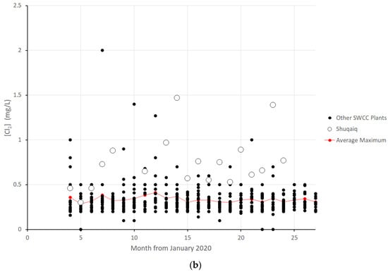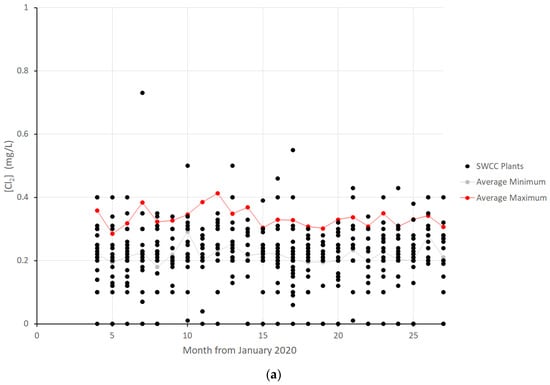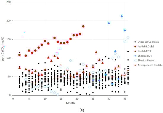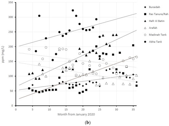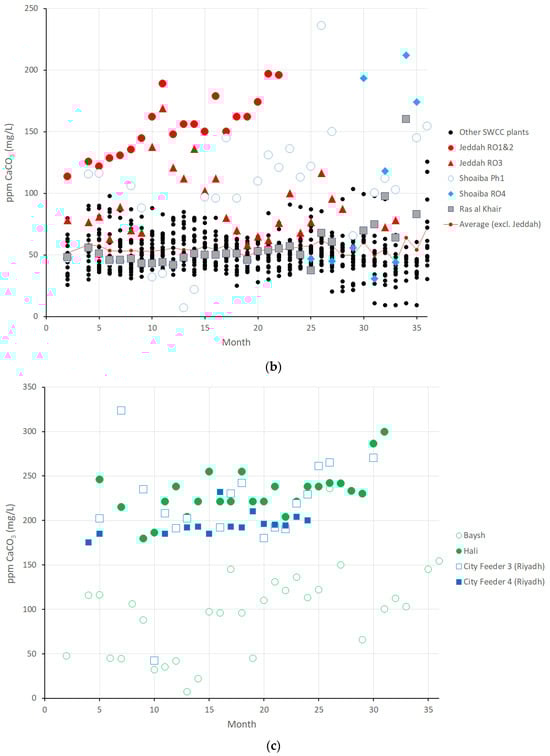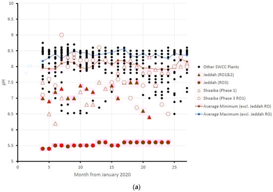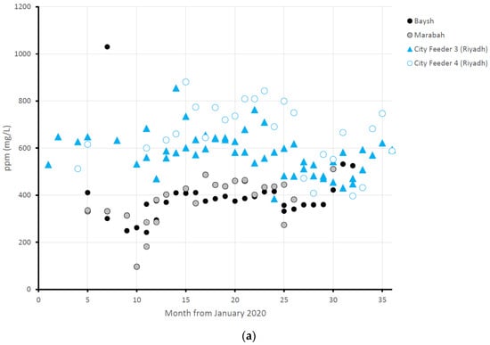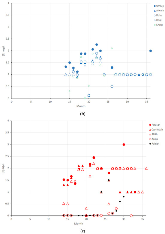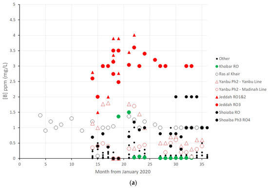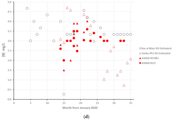 Boron values in excess of 2.4 ppm are reported on a few occasions at the smaller SWRO plants at Farasan and Qunfudah. The majority of the smaller plants in Figure 10b,c were built to the same plan and introduced at the same time to replace thermal plants on the Red Sea. It is most likely that the plants with low values are adjusting the pH in the second stage RO to ensure boron is present as dihydrogenborate ion, while those with high boron levels are not. The similar trend over the year for the plants with higher boron concentrations indicates the strong seasonal effect of temperature on boron passage [20]. Khafji, which is located in waters that have a very large change in temperature from winter to summer (~17–37 °C), has low boron levels in the cooler months, and the plants in the southern part of the Red Sea (Farasan, Qunfudah, Allith) with maximum water temperatures of 33–34 °C have boron levels greater than plants in the northern part of the Red Sea (Haql, Duba, Alwajh) with maximum water temperatures of 28–30 °C [21].