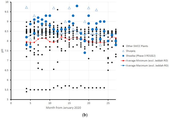 Minimum (a) and maximum (b) pH values recorded in SWCC desalination plants, 2020–2021. MEWA requirements are between pH 6.5 and pH 8.5.
