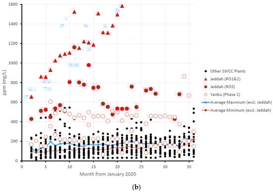 Minimum (a) and maximum (b) total dissolved solid (TDS) values recorded in SWCC Desalination Plants, 2020–2022. MEWA guidelines are between 100 and 1000 mg/L.