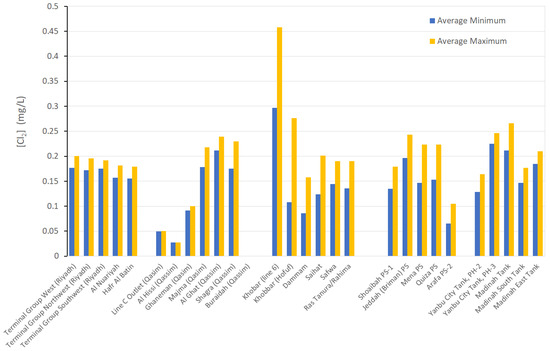 Excursions below the minimal residual chlorine level were reported from numerous desalination plants, but the average minimum value was maintained at 0.20 ppm or above at almost all plants, with only Khobar 2, Shuqaiq, and the plants at Shoaibah giving average minimum residual chlorine values between 0.15 and 0.19 ppm.