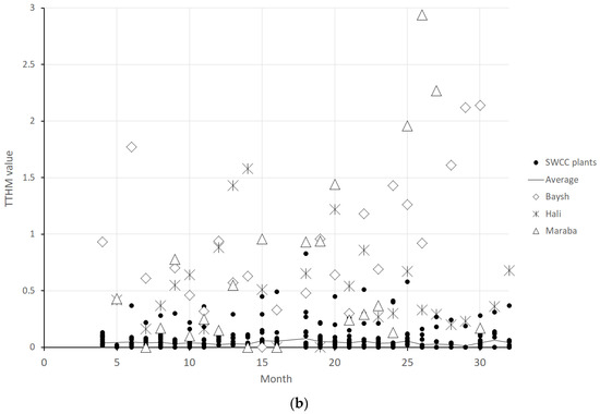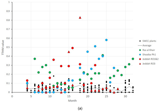 From Figure 8, it can be seen that all SWCC desalination plants met TTHM limits at all times. Plants frequently reporting relatively high TTHM values were Ras al Khair, Shoaibah 1, and the RO plants at Jeddah. However, no levels measured are of any concern. Levels above the MEWA guidelines were, however, reported at certain times of the year for all water produced from the three dams. As these surface waters will be expected to carry a much larger load of organic material, this is not entirely unexpected. The high residual chlorine values reported from Shuqaiq are not reflected in elevated TTHM values; instead, Shuqaiq showed the lowest aggregate TTHM concentration of any major SWCC desalination plant (Table 1).