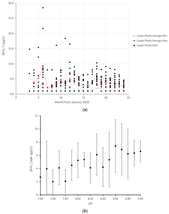 As the minimum bromate levels are dominated by points recorded as below the limit of detection (2 ppb), approximated as 1 ppb for graphing, the seasonal temperature dependence of bromate levels is likely to be more prominent than noted in Figure 9a. The other main significant factor that should be correlated with bromate concentration in produced water is pH, but no clear correlation between plant-produced water pH and bromate concentration was apparent in the data.