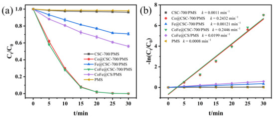 In order to investigate the practical effects of the five different catalysts prepared (CSC-700, Co@CSC-700, Fe@CSC-700, CoFe@CSC-700, and CoFe@CS) applied for the degradation of LEVs by activated PMS and to select the best-performing samples for the subsequent experiments, firstly, adsorption experiments were carried out without the addition of PMS, and the results are shown in Figure 4. When CSC-700, Co@CSC-700, Fe@CSC-700, CoFe@CSC-700, and CoFe@CS were used alone, none of them adsorbed more than 10% of LEV within 30 min, so the adsorption capacity of these five materials was negligible during the whole degradation process. The effect of the five different catalysts prepared on the removal of LEV within the PMS system was mainly a degradation effect rather than an adsorption effect.