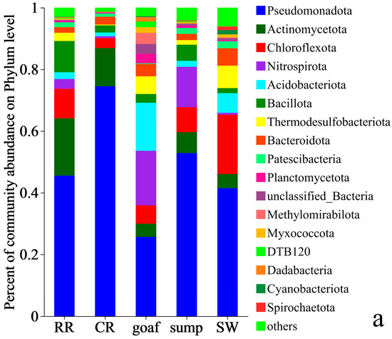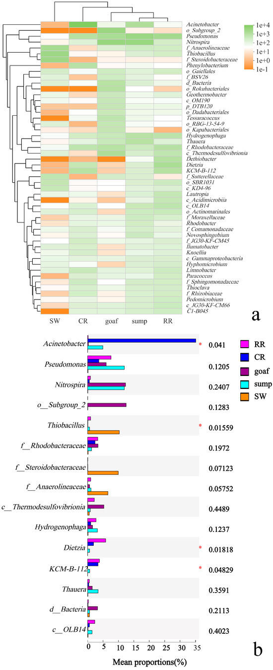 - The microbial community richness and diversity were ranked as follows: surface water > rock roadways > sumps > coal roadways ≥ goafs. The microbial community composition in the different functional zones were eminently different. Surface water sediments and underground coal mine samples belong to two branches in the sample clustering. Thioclava, which can accelerate the oxidation of pyrite, had a higher abundance in coal roadways. Bacteria related to SO42− reduction (i.e., c_Thermodesulfovibrionia, Desulfomicrobium and Geothermobacter) and nitrification (i.e., Nitrospira) accounted for higher proportions in goafs. Cyanobacteriota and Spirochaetota, which perform oxygen-producing photosynthesis, were only found in surface water sediments.