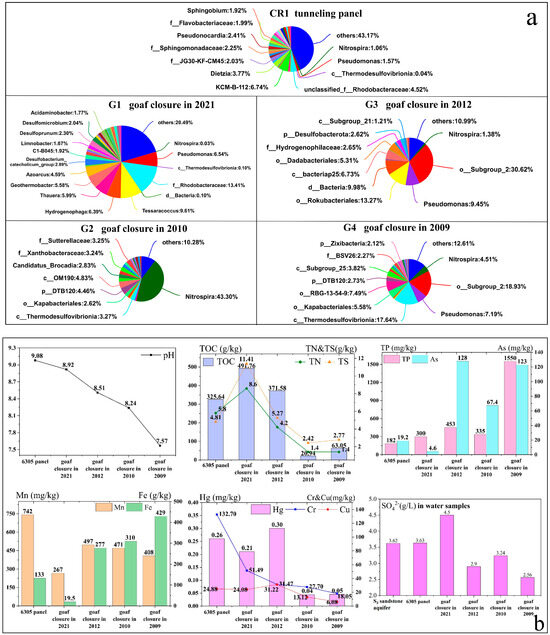 - Goafs were the critical zones of mine water pollution prevention and control. Compared with a tunneling panel, the bacteria with a sulfate reduction function (SRB) had relatively higher proportions in goafs, and the functions of sulfate respiration and respiration of sulfur compounds were highest in the goaf closed in 2021. In addition, with the increase in goaf closure time, the concentration of the characteristic pollutant SO42− in water samples decreased, while As and Fe in sediments increased, suggesting that goafs were able to purify themselves. The small-molecule organic matter released from coal could also provide a continuous carbon source for SRB. Therefore, microbial treatment technologies such as artificial enhancement of SRB reducing sulfate could be applied to remediate groundwater pollution in coal mine areas.