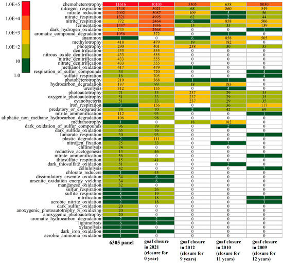 - After mining is finished for a certain panel, a wall is built to close it for safety; the panel is called the goaf at this time. The continuous entry of groundwater gradually raises the water level in the goaf; coupled with the consumption of biochemical reactions, this results in a gradual reduction in the level of O2. At this time, the goaf becomes a key zone where physical, chemical and biological changes occur. Thus, the goafs whose water supply source aquifers were all S3 sandstone groundwater were selected for this study (goafs: G1, G2, G3, G4). Here, we had to substitute space for time in the experimental design (the goafs were closed in 2021, 2012, 2010 and 2009) because the microbial community and geochemical characteristics of goafs closed several years ago were not detected.