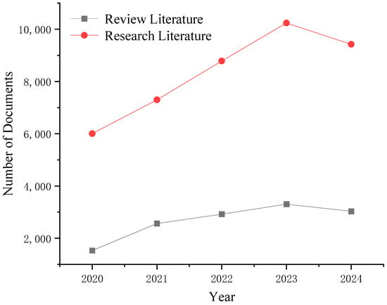 A study by Guimarães et al. on zebrafish larvae found that microplastics can damage neural tissue and cause metabolic imbalances []. Lu et al.’s study on human umbilical vein epithelial cells revealed that 500 nm microplastics can effectively interact with cell membranes, causing damage, while 100 nm microplastics not only cause cell membrane damage but also induce autophagosome formation and disrupt autophagic flow []. Therefore, studying new pollutants is crucial for environmental protection and public health maintenance. Statistics from the ScienceDirect core collection database show that the number of articles on new pollutants has been increasing over the past five years, as illustrated in Figure 1.