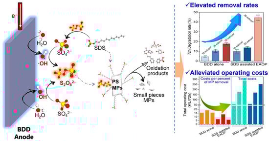 - Lu, J.; Hou, R.; Wang, Y.; Zhou, L.; Yuan, Y. Surfactant-sodium dodecyl sulfate enhanced degradation of polystyrene microplastics with an energy-saving electrochemical advanced oxidation process (EAOP) strategy. Water Res. 2022, 226, 119277. [Google Scholar] [CrossRef] [PubMed]