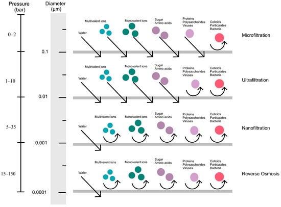 Typical EDCs are characterized by their large molecular masses, which determine that they can be effectively removed using membrane separation techniques. The membrane separation methods currently employed in many applications include microfiltration (MF), ultrafiltration (UF), nanofiltration (NF), and reverse osmosis (RO). Figure 4 illustrates the characteristics of each membrane type.