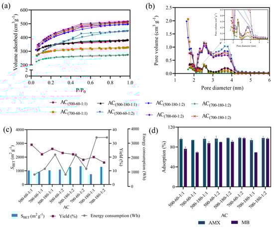 N2 adsorption/desorption isotherms (a), pore distribution (b), SBET, yield, and energy consumption for the produced AC (c), and the percentage of adsorption of MB and AMX (d). (Conditions: 100 mg L−1 solution, material dose of 1 g L−1, 120 rpm for 24 h at room temperature).