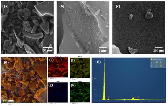 SEM-FEG of sample AC700-60-1:2 at 1000 (a), 20,000 (b), and 200,000 (c) times magnification. Elemental mapping of C, O, S, and P (d), carbon (e), phosphorus (f), sulfur (g), oxygen (h), and spectrum EDS (i).