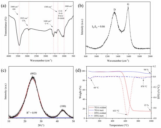 FT-IR (a), Raman (b), XRD (c), and TGA (d) of the optimized AC (AC700-60-1:2).