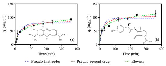 The adsorptive performance of AC700-60-1:2 in removing the MB cationic dye and the AMX antibiotic from aqueous media was investigated in the present work. Figure 4a,b show the experimental kinetic curves (qt vs. t) of the adsorption of MB and AMX on AC700-60-1:2 and the corresponding fittings. The fitted parameters for each system, using pseudo-first-order, pseudo-second-order, and Elovich non-linear models, are listed in Table 4.