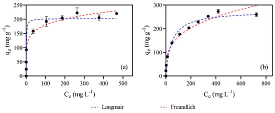 Equilibrium adsorption tests were carried out by shaking 1 g L−1 of AC with single solutions of MB and AMX with concentrations ranging from 25 to 1000 mg L−1. The experimental conditions used in the batch experiments are the same as those described in topic (iv) of Section 2.2.1. Afterward, the amount of MB and AMX in the aqueous phase was determined, the concentration of contaminant adsorbed at equilibrium (qe, mg g−1) was calculated by Equation (7), and the experimental results were fitted to two non-linear models usually applied to describe the adsorption equilibrium isotherms: the Langmuir [] and Freundlich [] models, represented by Equations (8) and (9), respectively: