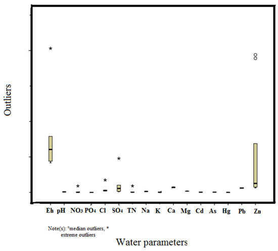 The analysis of the samples included 21 parameters, comprising temperature (T), pH, electrical conductivity (EC), cations (Na+, K+, Ca2+, and Mg2+), anions (Cl−, NO3−, SO42−, and PO43−), and trace elements (Cd, Hg, Pb, As, and Zn). Careful standardization, procedural blank measurements, and duplicate samples ensured the quality of the analytical data. The laboratory also participates in a regular national program of analytical quality control. The basic statistics of the water-quality dataset are summarized in Table 1. The statistical summaries of the parameters analyzed using box and whisker plots are shown in Figure 2. Box and whisker plots are particularly useful when examining summaries of numerical data. They facilitate the identification of potential outliers and abnormal distributions and enable a quick and easy comparison of distributions by displaying the overall range, spread, and center, thus helping to visualize the numerical summary. The recommended mean values of the World Health Organization, European Parliament and Council of the European Union 2006, and MWQ Serbia are presented in Table 2.