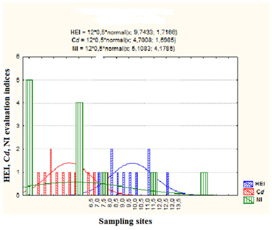 where Hc is the monitored value, and Hmac is the maximum admissible concentration of the ith parameter. The degree of heavy metal index was classified into three divisions as follows: HEI ≤ 10: low, HEI (10–20): medium and HEI > 20: high [18].