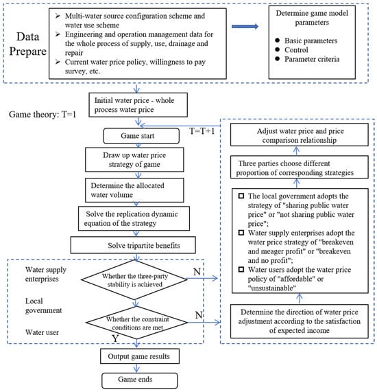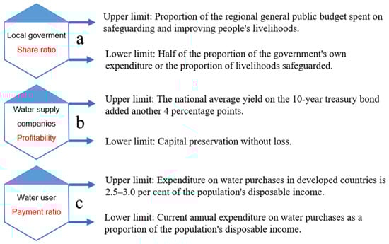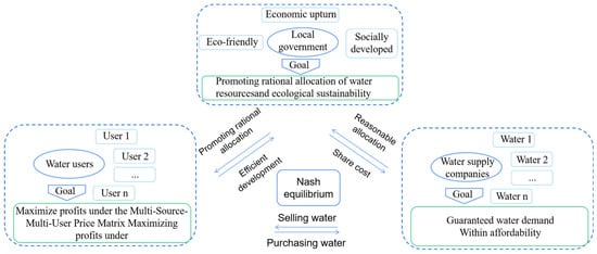 The game of water prices involves the interests of the government, water supply enterprises, and water users; all parties influence and restrict each other in the game of water price regulation [39]. Water supply companies aim to balance high prices for investment recovery with users’ desire for affordable, reliable water services. The government has the responsibility to set water prices and supervise water supply enterprises and needs to take into account the reasonable demands of water users and obtain reasonable price relations between different users with different water sources to obtain more social, environmental, and ecological benefits.