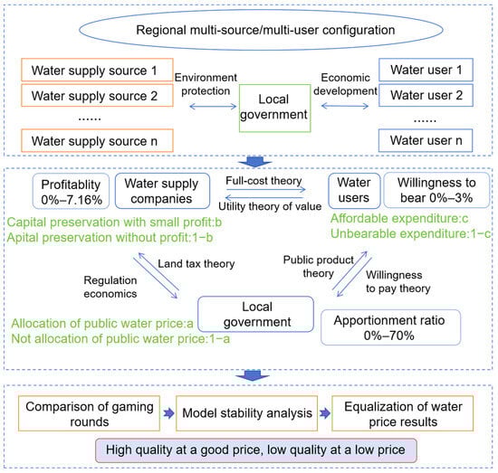 The formulation of water prices is influenced by factors such as cost, water quality, scarcity of water sources, affordability of water prices, and policies [28]. The different water quality of various water sources can lead to differences in consumer preferences [29]. The better the water quality, the higher the social acceptance level and the lower the social acceptance level of low-quality water. This leads to the poor quality but high cost of recycled water, resulting in problems such as no one paying for recycled water [30,31]. Therefore, in the process of multi-water source and multi-user pricing, in addition to emphasizing the cost of water control, there is also a need to fully leverage the government’s management and regulation of water prices. Game theory is an excellent way to solve this kind of problem [32]. Suppose a reasonable price comparison relationship between multiple water sources and multiple users is achieved, achieving a balance of interests among local governments, water supply enterprises, and water users, and promoting the rational allocation and efficient utilization of various water sources; in that case, there will inevitably be competition and game regarding interests among the three parties [33], as shown in Figure 1. From the perspective of overall regulation and control of the government, comprehensively consider the systematisms and synergy of different water sources, pay full attention to the attributes of public goods and positive externality brought by the utilization of multiple water sources, highlight the water price saved by external environmental remediation during the utilization of renewable water resources and the ecological environment effect generated, and pursue the overall rational allocation of water resources [34], water conservation, and promotion of renewable water. From the perspective of water supply enterprises, the aim is to maximize water supply returns to recover investment and maintain daily operations. From the perspective of water users, we strive to minimize water purchase expenses and obtain stable and high-quality water supply services with low water prices [35]. The water price game has many subjects and different goals. The water quantity and quality of multiple water sources significantly impact the willingness to pay of many types of water users. The existing tools and methods that impact the willingness to pay of water users are difficult to quantify accurately. Tripartite payoff game model theory is a theoretical method that combines dynamic evolution analysis with game theory, emphasizing a dynamic equilibrium [36,37]. Therefore, this study adopts the tripartite payoff game model theory to solve the multi-attribute and multi-source water price equilibrium problem [38].