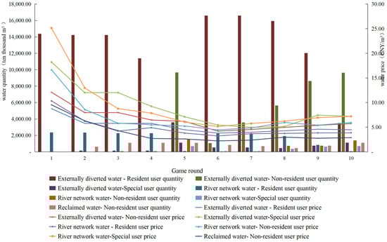 In the game process, the initial strategy is determined by using the relationship between the water price and the multi-source water price of the entire process in Pinghu City as the reference and then selecting the water use selection plan for various water users. Secondly, based on the water price strategy and water use plan, the allocation of water volume and the expected revenue of the three parties for each game round are solved, and it is judged whether the strategy meets the constraints [40]. At the same time, the economic benefits of the government, water supply enterprises, and water users are calculated separately. It is judged whether the economic benefits are maximized and whether the water volume meets the demand. If not, the local government, water supply enterprises, and water users adjust their strategies according to their respective proportions, the water supply enterprises according to the profit rate, and water users according to their ability to bear costs to reshape the price relationship by adjusting the water price. The game process reveals the results of each round’s calculations, outputting the equilibrium water price when the system’s economic benefits peak and meet the three parties’ constraints. To display the results of the three-party game model more directly, a price line chart was drawn to represent the water price and water resource allocation scheme in the game process, as shown in Figure 6.