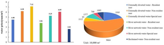 The water resource is a kind of renewable resource [1,2] that is not only sustainable but is also a limited and irreplaceable fluid resource [3,4]. The natural properties of water resources are determined by the mechanisms and evolutionary rules of their formation in the water cycle. The main impact of human economic activities on water resources is the consumption of water through water diversion, regulation, use, and storage within watersheds, which changes natural hydrological processes, such as evapotranspiration, water vapor transport, precipitation, and surface and groundwater flows, and exacerbates the greenhouse effect, leading to a warming trend in the global climate, resulting in droughts and floods becoming more severe [5]. With the rapid growth of regional populations, rapid economic and social development, and continuous deterioration of the water ecological environment, water scarcity has become a bottleneck that constrains social development and the unrestrained nature of traditional water and leads to the neglect of sustainable development. Water prices can adjust and guide the water demand [6], which is one of the important means to solving the contradiction between the supply and demand of water resources [7]. The issue of water-price-driven water resource allocation has received widespread attention from the academic community [8]. Cities and towns in the southern region of China initially explored the methods of setting prices for high-quality water, general water, and recycled water at the practical level of the water market in order to promote the use of a separate quality water supply and recycled water [9]. However, in terms of the current water pricing, the cost sharing of the main water supply bodies is not clear, and the overall level of the water price is low, which makes price leveraging to promote water conservation difficult, does not scientifically reflect the reasonable price ratio relationship between the water price and the prices of related products [10], and fails to systematically develop a theoretical level and practical application to reflect the differences between the water quality of different water sources [11]. At present, the problem of water shortage in China has developed to a very serious degree, so it is imperative to specify a scientific and reasonable price comparison relationship [12].