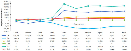 Through a series of adjustments and evolution, a comprehensive model and method have been developed to establish an optimal water price strategy that meets the needs of local governments, water supply enterprises, and water users, ultimately resulting in dynamic equations for water price changes and stakeholder expectations. The results from Table 4 are used in Formulas (3)–(9) to generate a line chart showing the expected income changes in a multi-water/multi-user game setup in Pinghu City across various rounds, as shown in Figure 8.