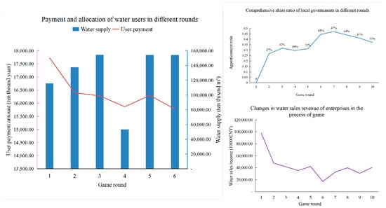 As seen from Figure 9, with the increase in the government allocation ratio, the whole game process leads to a gradual decrease in the water price trend and an increase in the water allocation. Rational allocation of water resources can increase participants’ returns [42]. Regarding water users’ total payment, there was a corresponding positive correlation between the water supply, namely the “more water” configuration, and the user payment, but in terms of their ratio, because of the game, there was greater efficiency in the user’s water spending, which can allow them to better meet their own water demand and enable optimal cost performance. In this study, the total amount paid by water users at the end of the game is RMB 994.91 million, which is higher than the revenue from water sales under the current water-pricing policy in Pinghu City of RMB 586.25 million but still lower than the upper limit of water expenditure of RMB 144.5 million. A two-way relationship between water supply enterprises and water users was achieved under the government’s share. Therefore, after the game, the water price and resource allocation scenario reduced the total payment amount of water users to the current level. At the same time, the income of water supply enterprises also increased, achieving the government’s distribution plan, revenue approach for water supply businesses, and pricing strategy for water while maintaining a balance according to the rational allocation theory of water resources. This ensures a harmonious relationship among the government, water suppliers, and water users in terms of expenses and profits, supporting the sustainable growth and utilization of water resources. It also establishes a justifiable comparison link between users based on water characteristics. The findings of the Pinghu City research exhibit that a rational cost proportion founded on numerous water origins without escalating the load on the authorities (i.e., the distribution proportion remains unaltered) efficiently encourages the utilization of reused water and attains harmonious advancement of water safety and water environmental ecological protection [43].
