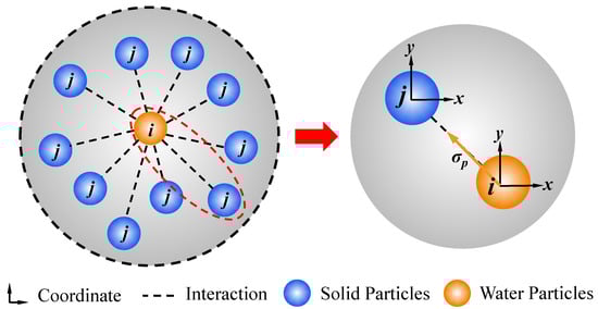 There exists liquid–solid contact surface between liquid particles (orange particles in Figure 2) and solid particles (blue particles in Figure 2), where liquid particle i exerts force (water pressure) on solid particle j. The water pressure is oriented along the liquid–solid particle line toward solid particle i and has a magnitude of σp. The normal vector between liquid particle i and solid particle j is defined as follows: For any contact pair between liquid particle and solid particle, its normal unit vector can be expressed as []: